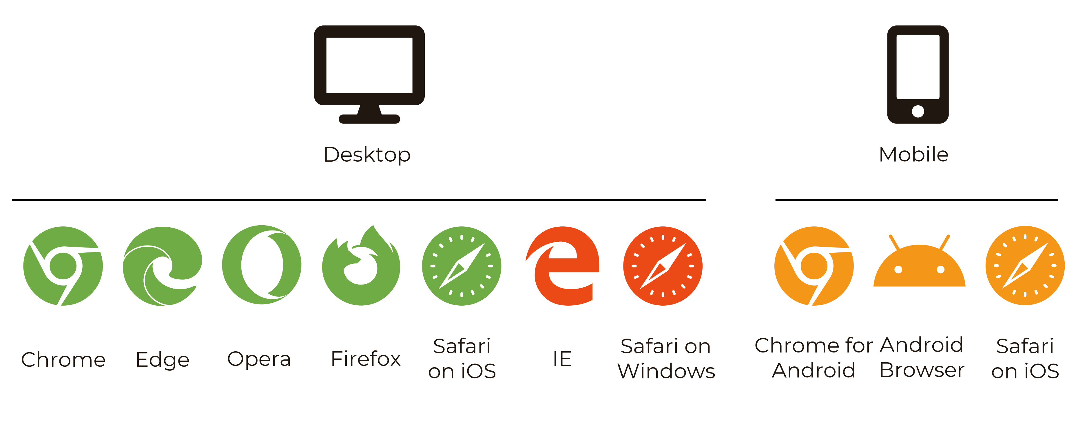 As it can be seen in the diagram above, the main browsers (Chrome, Edge, Opera, Firefox and Safari on iOS) are supported. Internet Explorer and Safari on Windows are not supported, since they are currently deprecated.