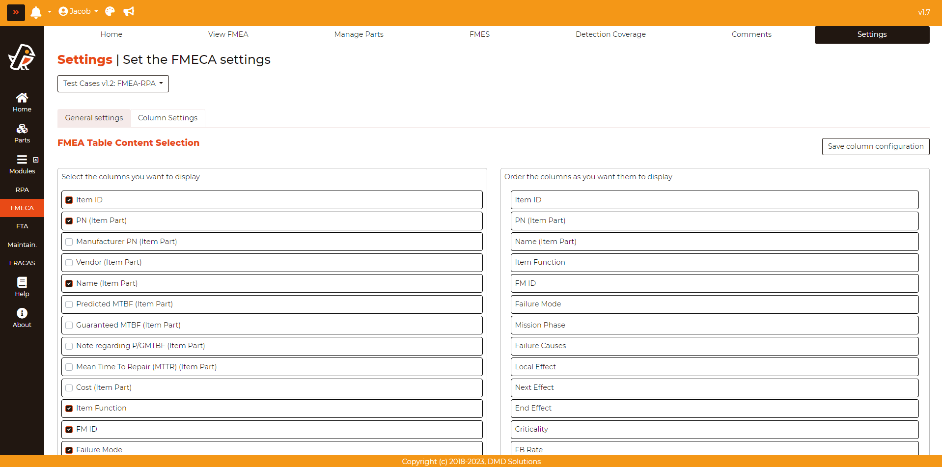 The user can also change the visibility and order of the columns of the FMECA Table inside the Column Settings option.