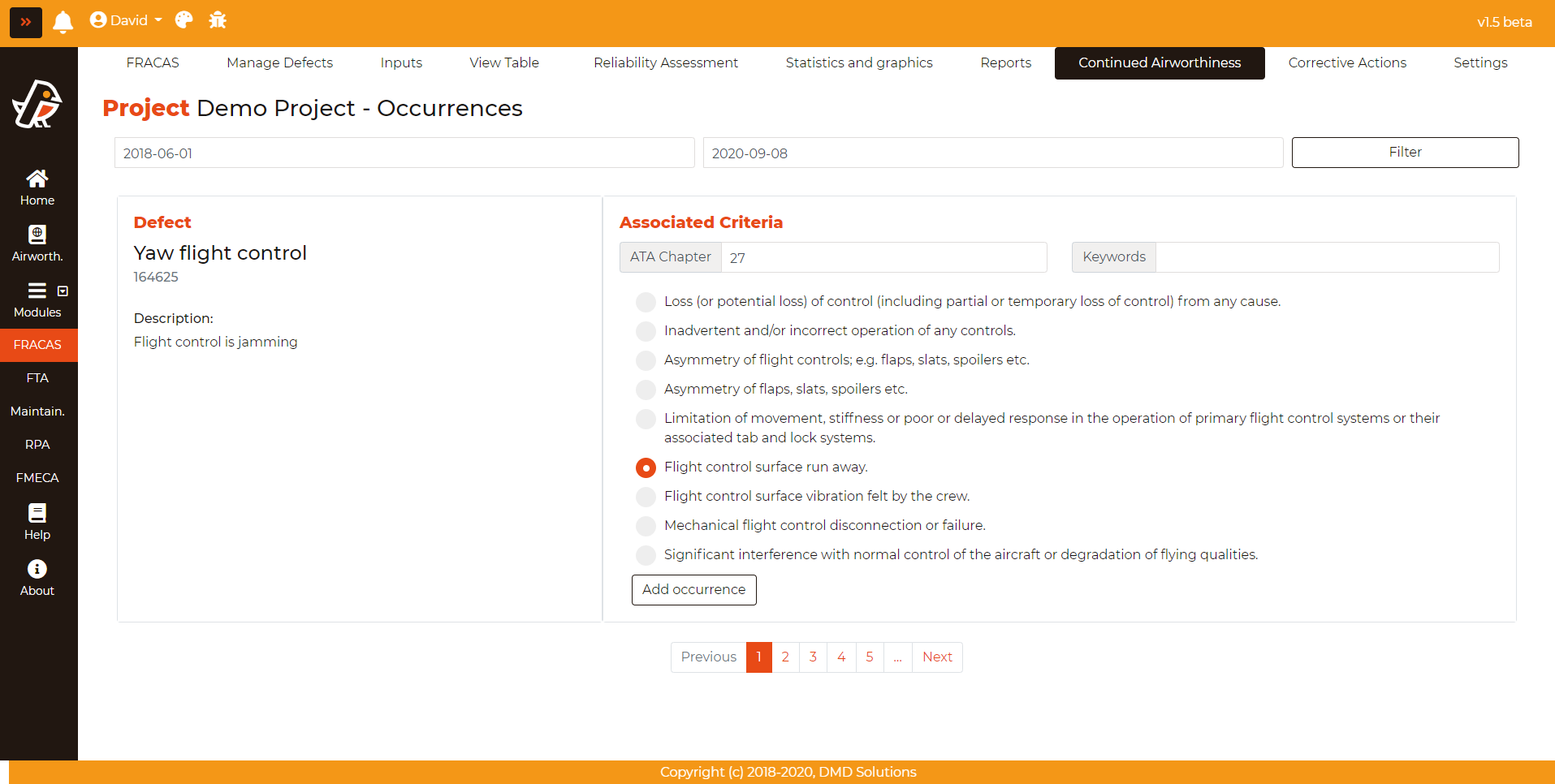 An occurrence is an aircraft malfunction that may endanger the safety of the aircraft. In order to raise an occurrence, the user can go to FRACAS > Continued Airworthiness. After filtering a period of time, all the defects are presented. Then, the user has to create an occurrence if necessary.
