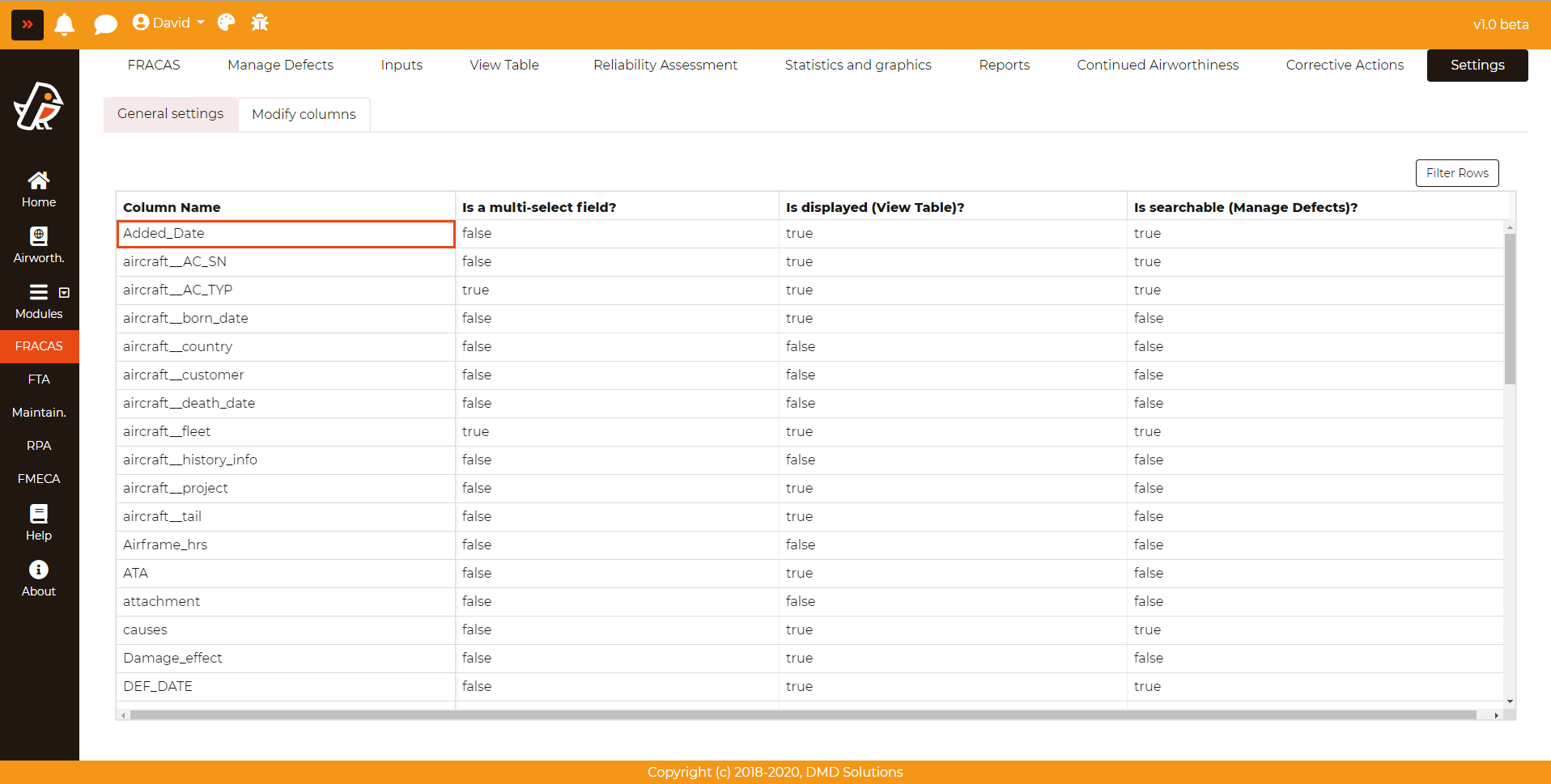 Specifically for the Defect tables, the user can customize all the fields in the following aspects:
