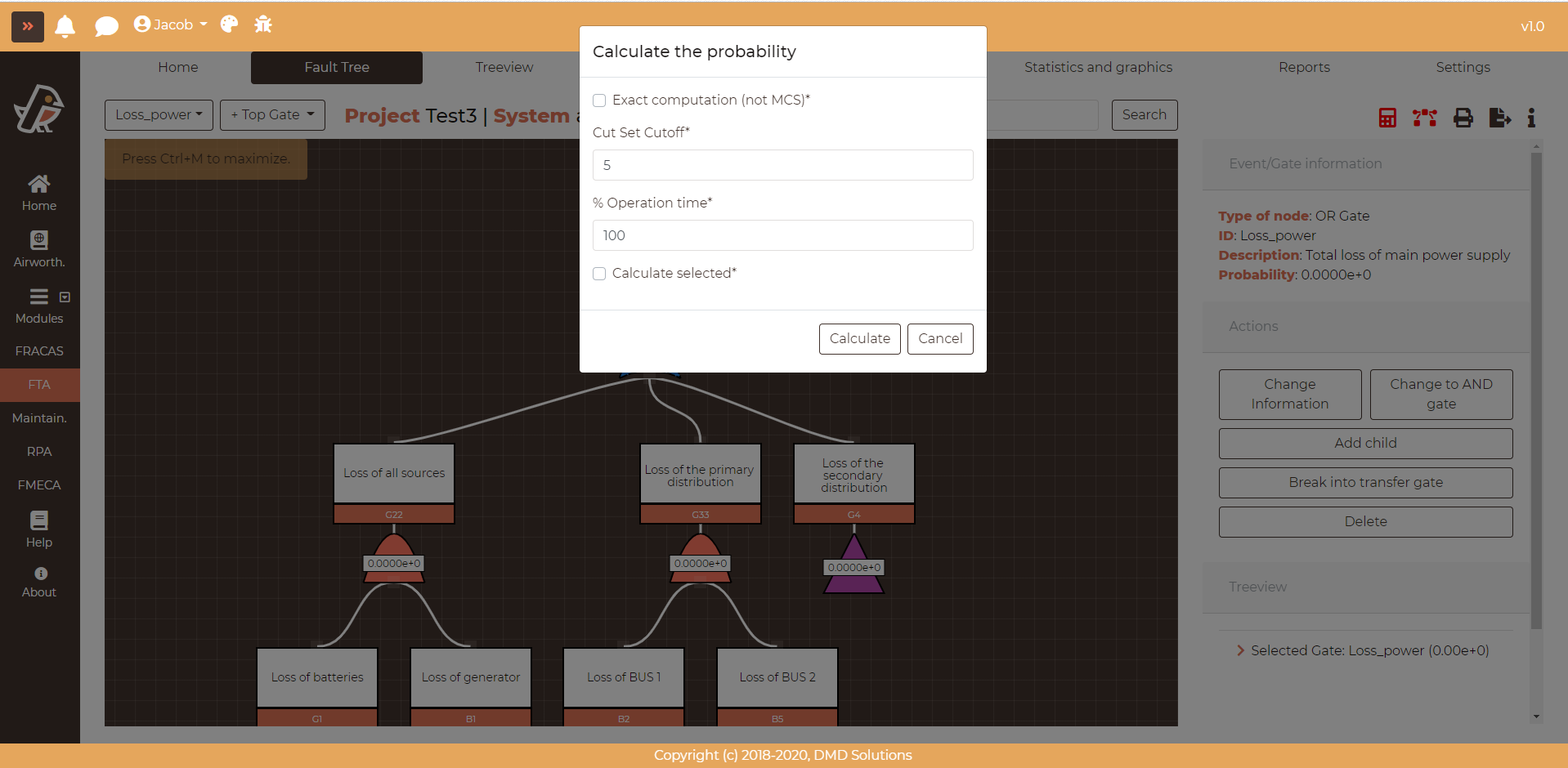 The Fault Tree module calculates the probability of failure (Unavailability) of a given fault tree. This probability can be calculated via two different types of calculation: The Exact method and the Minimal Cutsets method.