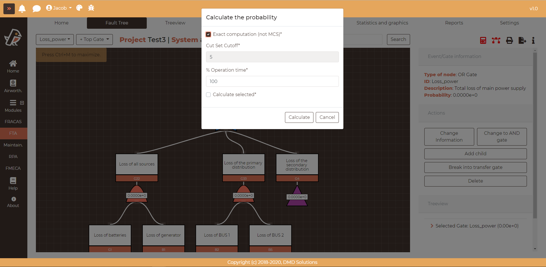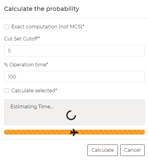 To calculate the Unavailability using the exact, click on the red calculator. Check the Exact computation (not MCS)* option. The user can define the percentage of operation time, the cutset cutoff parameter will be disabled for this calculation method. Finally, the user can calculate only a selected gate clicking first in a gate and checking the option Calculate selected*.