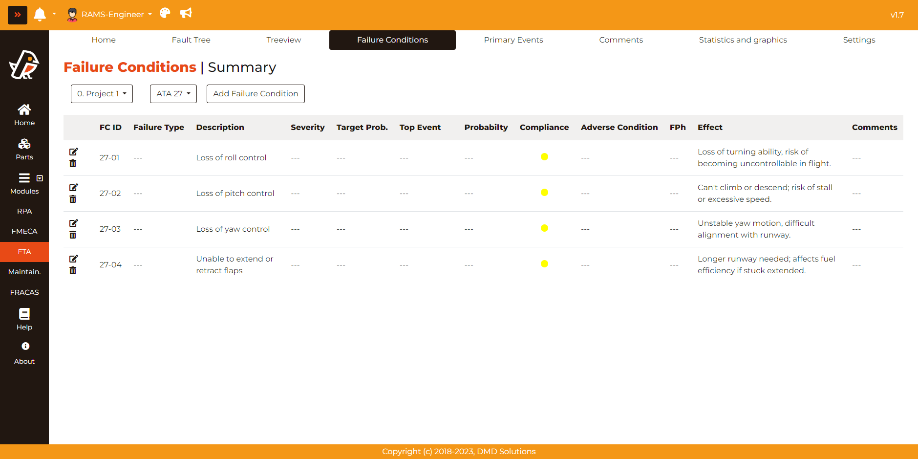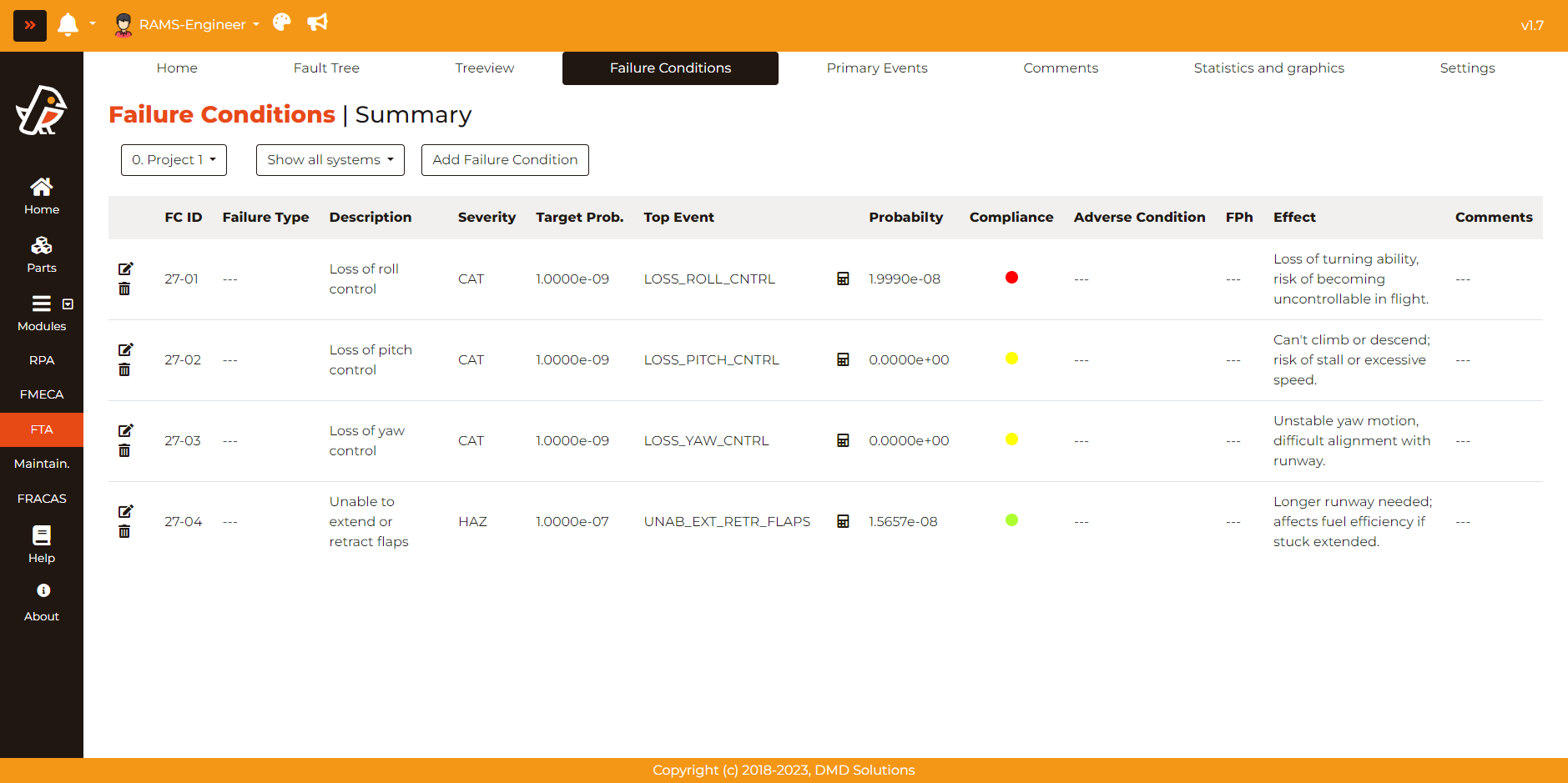 These colors serve as quick, intuitive markers for assessing the risk compliance of each Failure Condition.