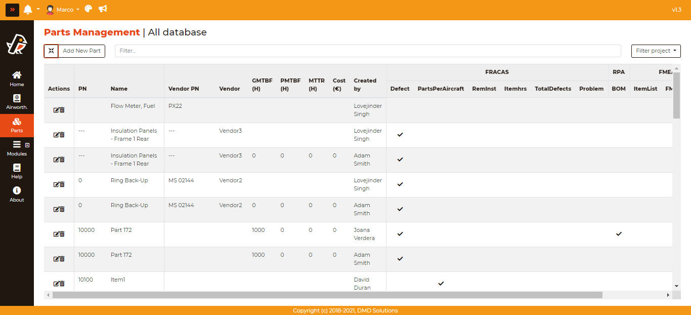 The Parts Management tab is a place where you can view the parts used in every single module, showing the part’s PN, Name, and where (table) in each module the part is being used (expressed with check marks).