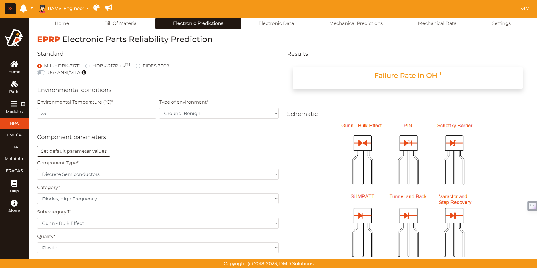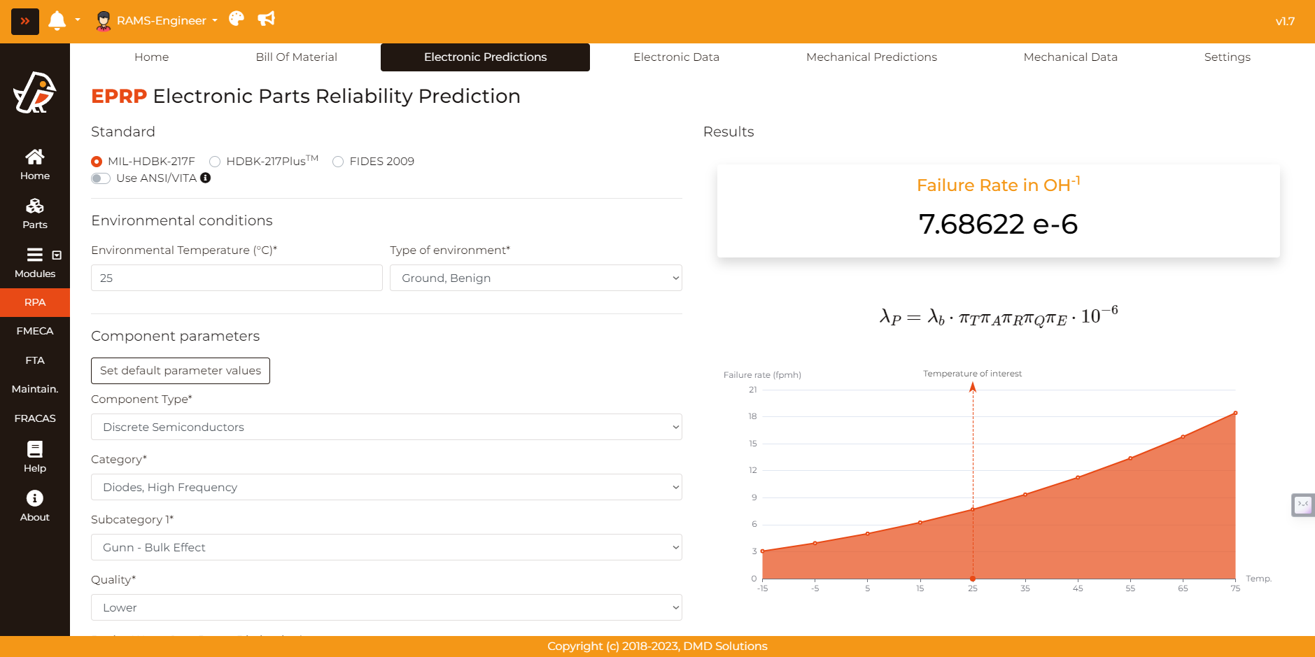 The FIDES 2009 model has specific features which make it being treated differently from other standards, as seen in the RPA > BOM. Two of its main characteristics are the prediction of the failure rate in calendar FIT and the use of special parameters (\(\pi_{PM}\) and \(\pi_{Process}\)) which are item dependent. A brief description of the FIDES special features is provided hereafter: